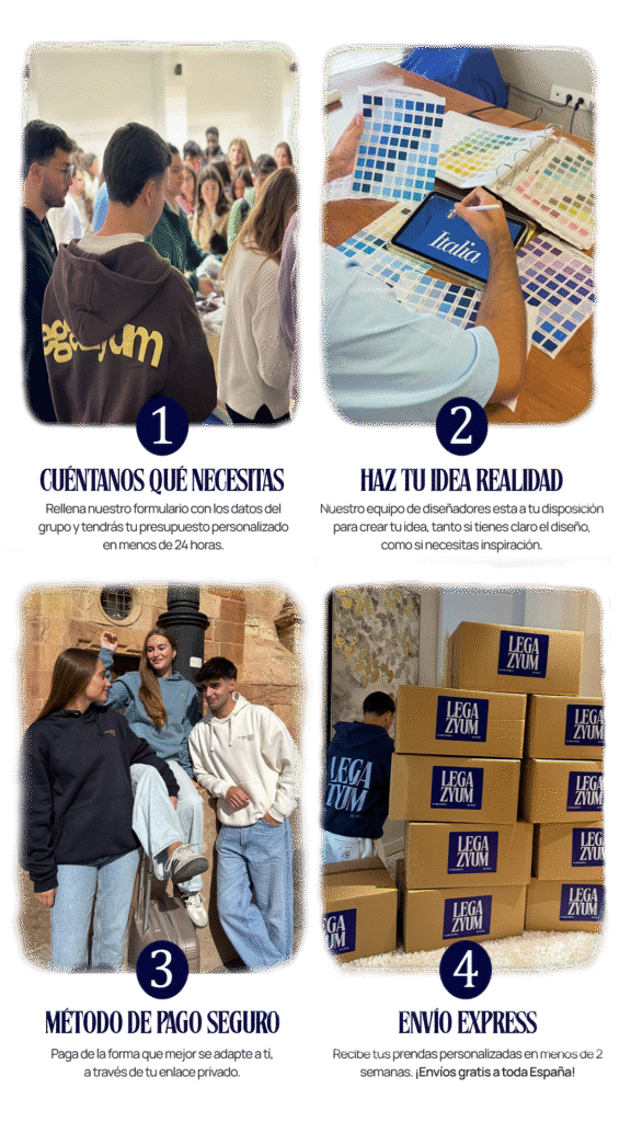Camisetas, sudaderas, polos… y siempre con la posibilidad de elegir tallas y colores distintos para cada grupo.